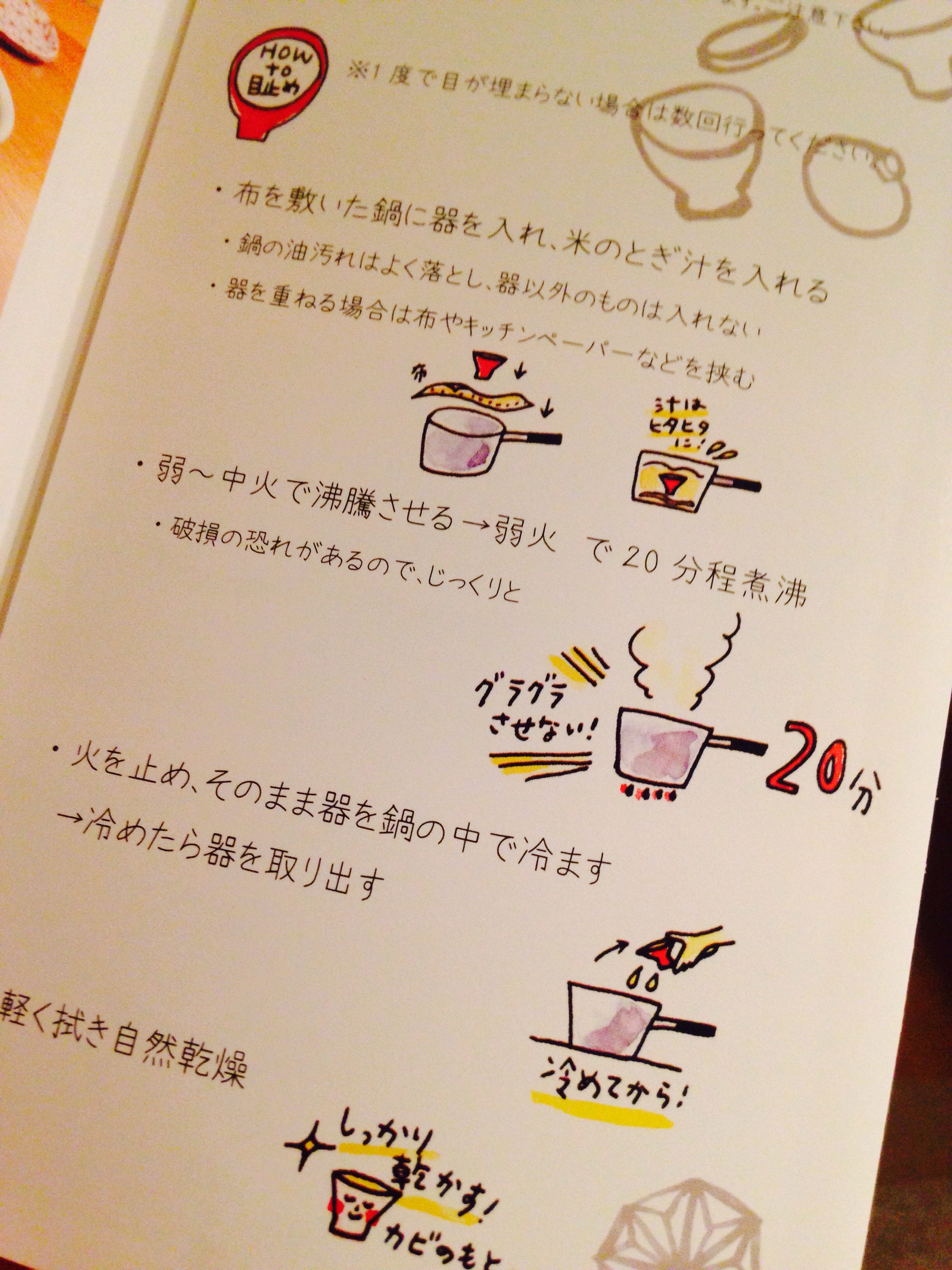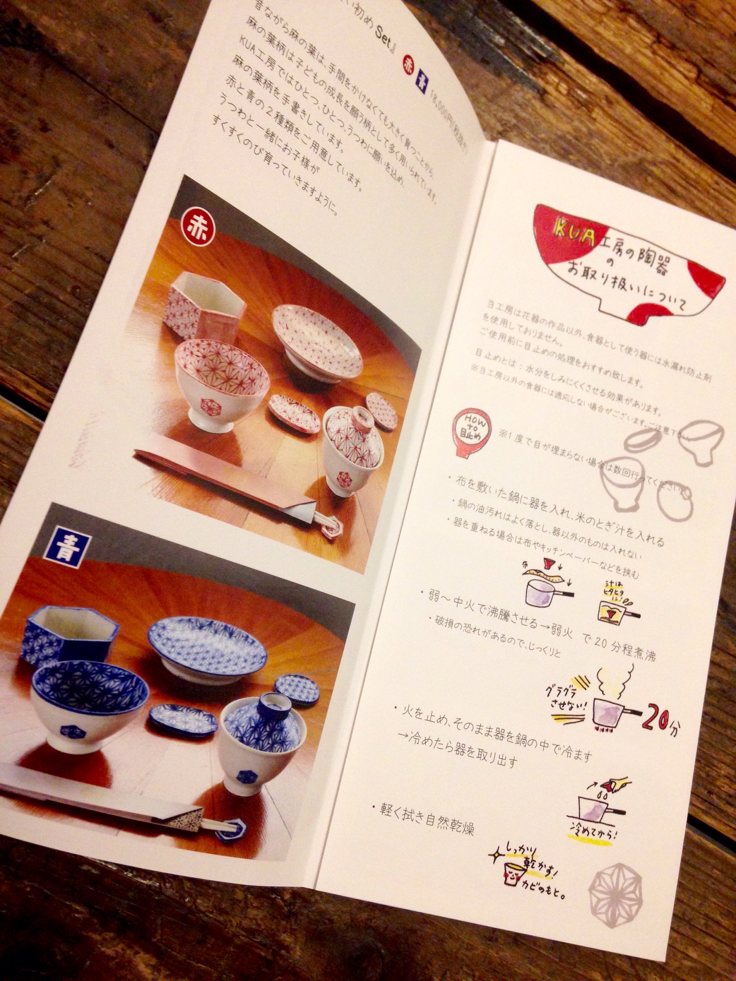全て手描きの陶製・麻模様のお食い初めセットについての物で、お取り扱いについてのイラストを描かせて頂きました。